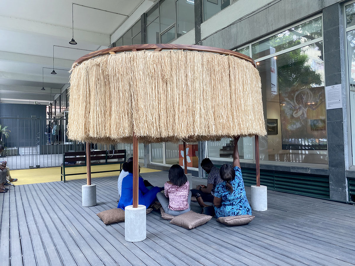 sador para a contemplação ou função. É feita para ser observada e também utilizada. Quando em frente a ela, um adulto apenas consegue ver ráfia; a pessoa do lado oposto não é visível. Só quando os visitantes se inclinam e se sentam sob o céu de ráfia é que conseguem ver-se e estabelecer contacto.